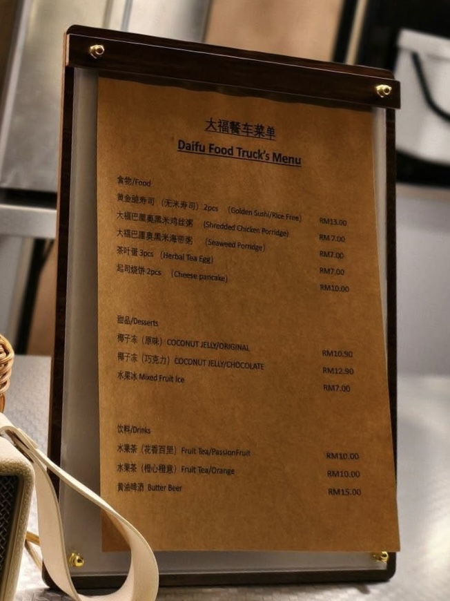 The Daifu Food Truck’s Menu is organized into three main sections: Food (食物), Desserts (甜品), and Drinks (饮料).